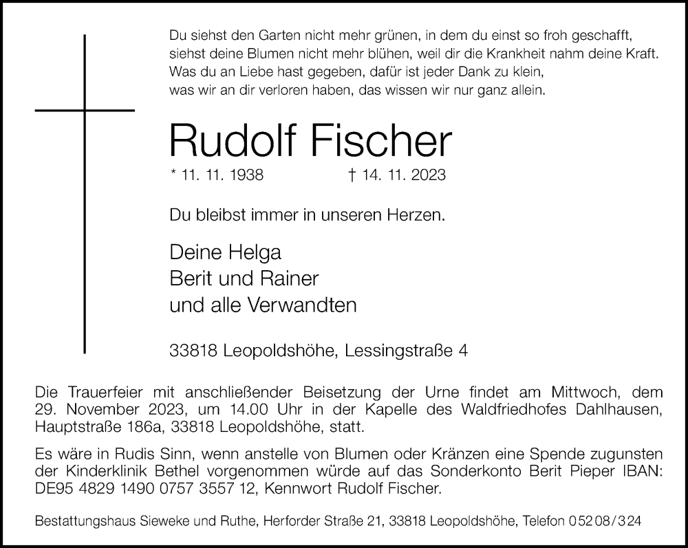 Hier finden Sie alle Traueranzeigen aus der Zeitung, die bisher für Rudolf Fischer erschienen sind. Weitere Traueranzeigen, die in der Zeitung erscheinen, werden hier ebenfalls aufgelistet