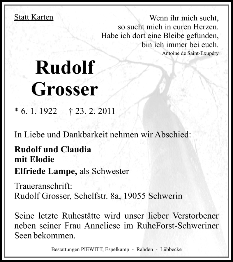 Hier finden Sie alle Traueranzeigen aus der Zeitung, die bisher für Rudolf Grosser erschienen sind. Weitere Traueranzeigen, die in der Zeitung erscheinen, werden hier ebenfalls aufgelistet