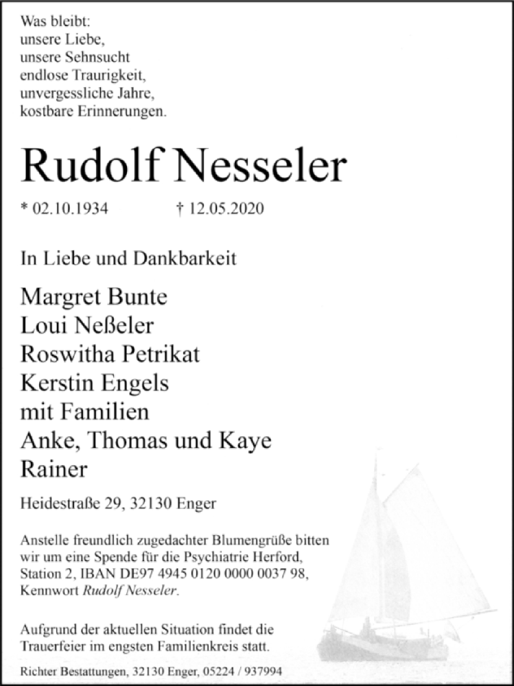 Hier finden Sie alle Traueranzeigen aus der Zeitung, die bisher für Rudolf Nesseler erschienen sind. Weitere Traueranzeigen, die in der Zeitung erscheinen, werden hier ebenfalls aufgelistet