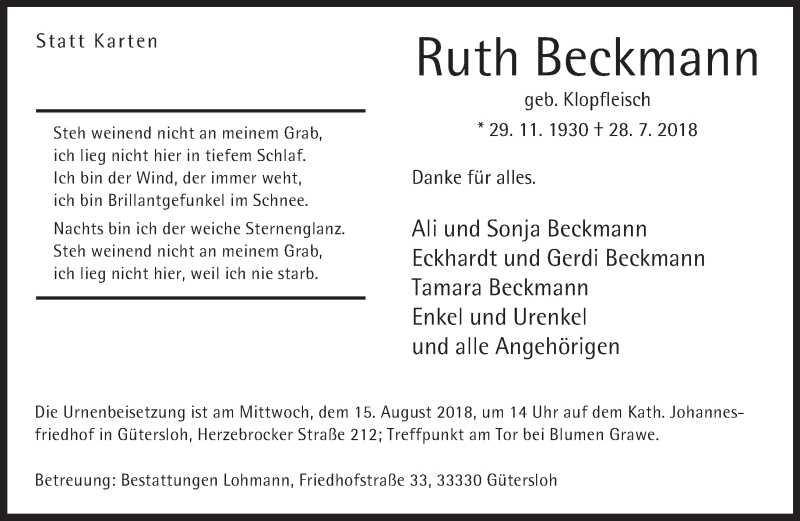 Hier finden Sie alle Traueranzeigen aus der Zeitung, die bisher für Ruth Beckmann erschienen sind. Weitere Traueranzeigen, die in der Zeitung erscheinen, werden hier ebenfalls aufgelistet