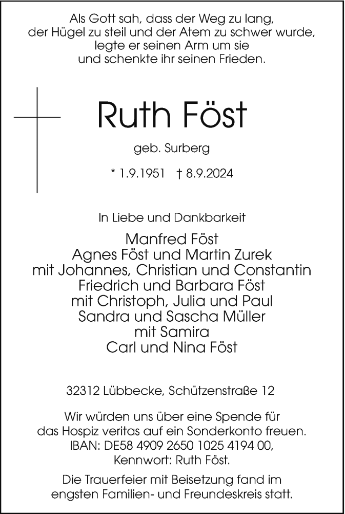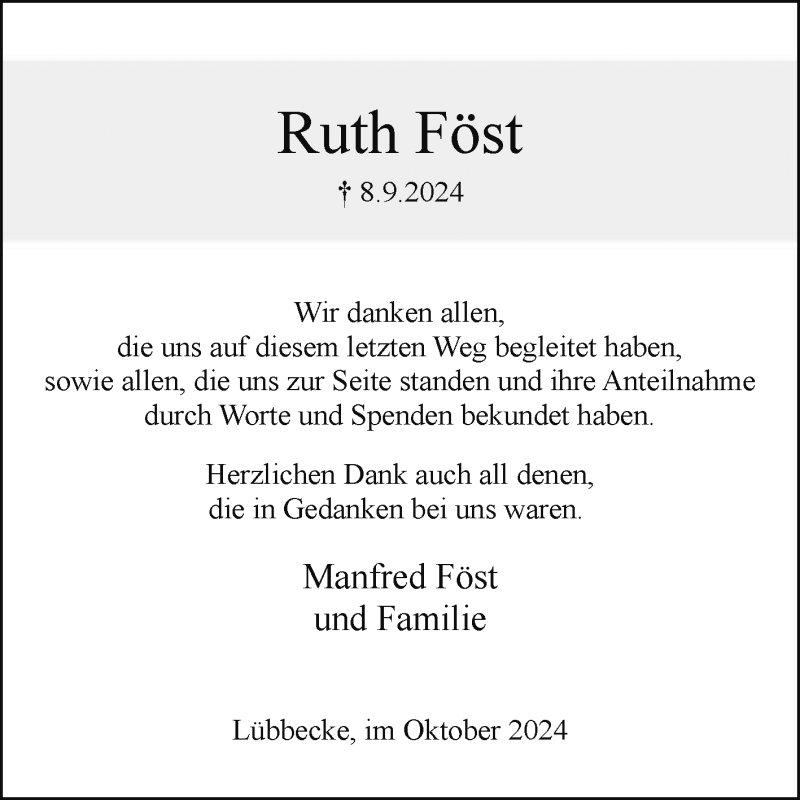 Hier finden Sie alle Traueranzeigen aus der Zeitung, die bisher für Ruth Föst erschienen sind. Weitere Traueranzeigen, die in der Zeitung erscheinen, werden hier ebenfalls aufgelistet
