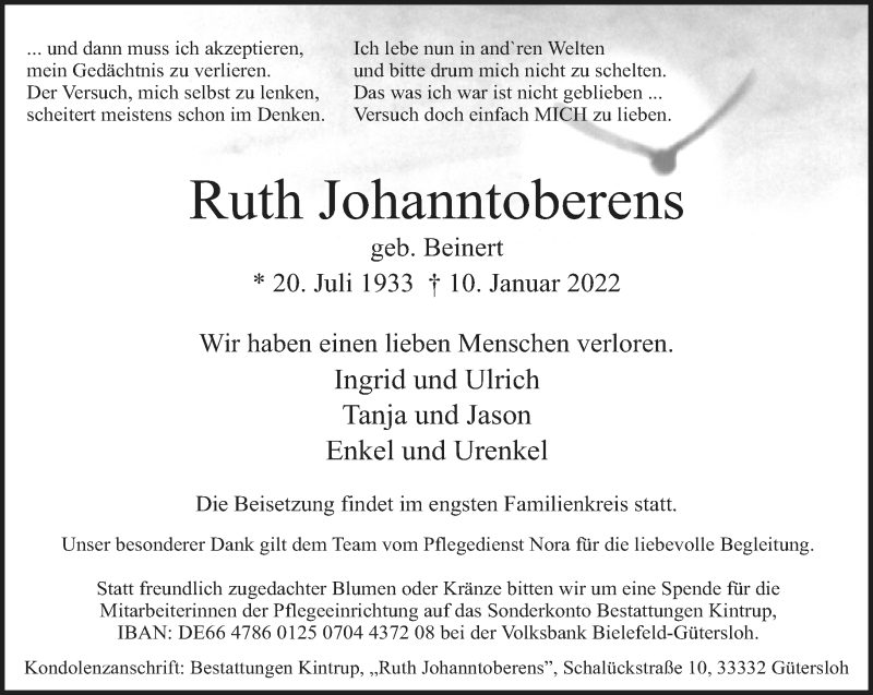 Hier finden Sie alle Traueranzeigen aus der Zeitung, die bisher für Ruth Johanntoberens erschienen sind. Weitere Traueranzeigen, die in der Zeitung erscheinen, werden hier ebenfalls aufgelistet
