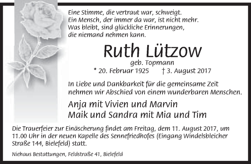 Hier finden Sie alle Traueranzeigen aus der Zeitung, die bisher für Ruth Lützow erschienen sind. Weitere Traueranzeigen, die in der Zeitung erscheinen, werden hier ebenfalls aufgelistet