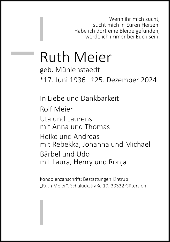Hier finden Sie alle Traueranzeigen aus der Zeitung, die bisher für Ruth Meier erschienen sind. Weitere Traueranzeigen, die in der Zeitung erscheinen, werden hier ebenfalls aufgelistet