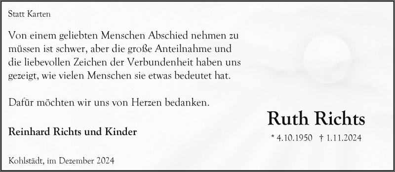 Hier finden Sie alle Traueranzeigen aus der Zeitung, die bisher für Ruth Richts erschienen sind. Weitere Traueranzeigen, die in der Zeitung erscheinen, werden hier ebenfalls aufgelistet