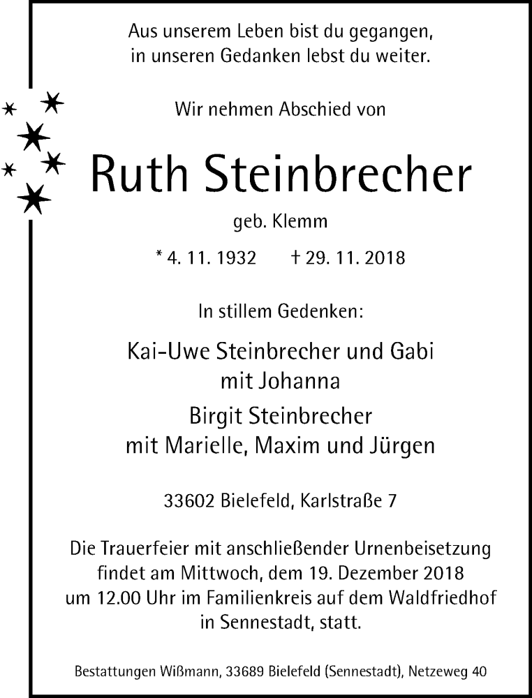 Hier finden Sie alle Traueranzeigen aus der Zeitung, die bisher für Ruth Steinbrecher erschienen sind. Weitere Traueranzeigen, die in der Zeitung erscheinen, werden hier ebenfalls aufgelistet