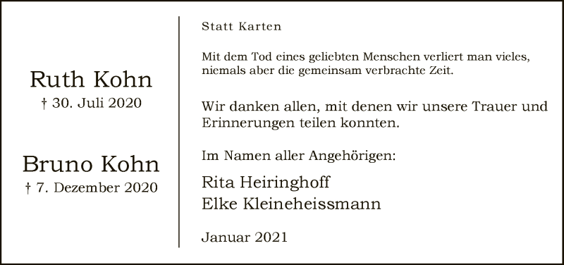 Hier finden Sie alle Traueranzeigen aus der Zeitung, die bisher für Ruth und Bruno Kohn erschienen sind. Weitere Traueranzeigen, die in der Zeitung erscheinen, werden hier ebenfalls aufgelistet