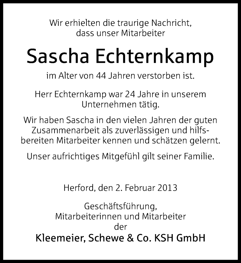 Hier finden Sie alle Traueranzeigen aus der Zeitung, die bisher für Sascha Echternkamp erschienen sind. Weitere Traueranzeigen, die in der Zeitung erscheinen, werden hier ebenfalls aufgelistet