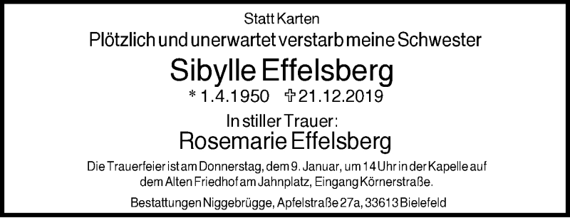 Hier finden Sie alle Traueranzeigen aus der Zeitung, die bisher für Sibylle Effelsberg erschienen sind. Weitere Traueranzeigen, die in der Zeitung erscheinen, werden hier ebenfalls aufgelistet