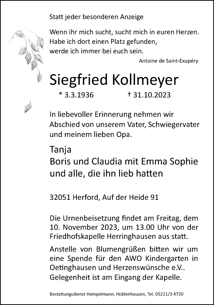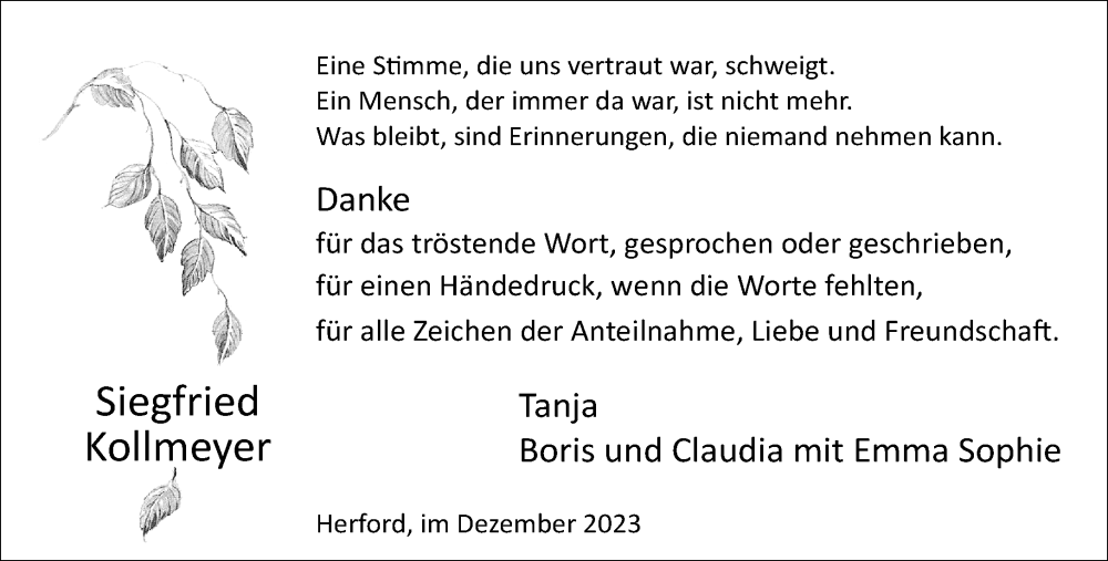 Hier finden Sie alle Traueranzeigen aus der Zeitung, die bisher für Siegfried Kollmeyer erschienen sind. Weitere Traueranzeigen, die in der Zeitung erscheinen, werden hier ebenfalls aufgelistet