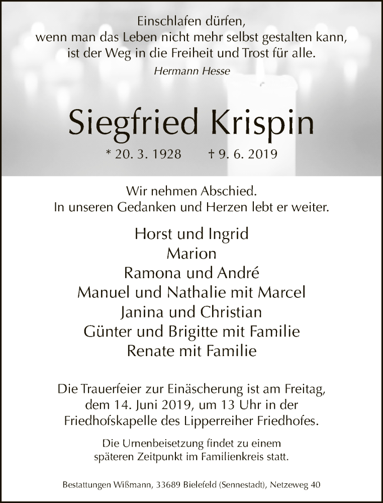 Hier finden Sie alle Traueranzeigen aus der Zeitung, die bisher für Siegfried Krispin erschienen sind. Weitere Traueranzeigen, die in der Zeitung erscheinen, werden hier ebenfalls aufgelistet