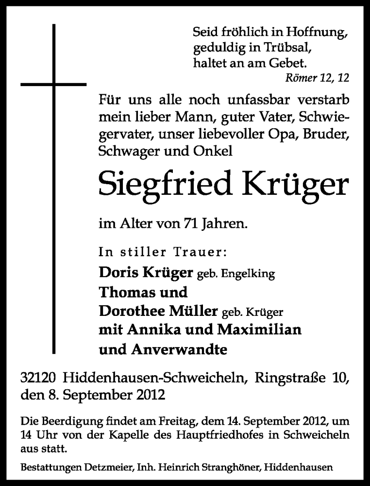 Hier finden Sie alle Traueranzeigen aus der Zeitung, die bisher für Siegfried Krüger erschienen sind. Weitere Traueranzeigen, die in der Zeitung erscheinen, werden hier ebenfalls aufgelistet