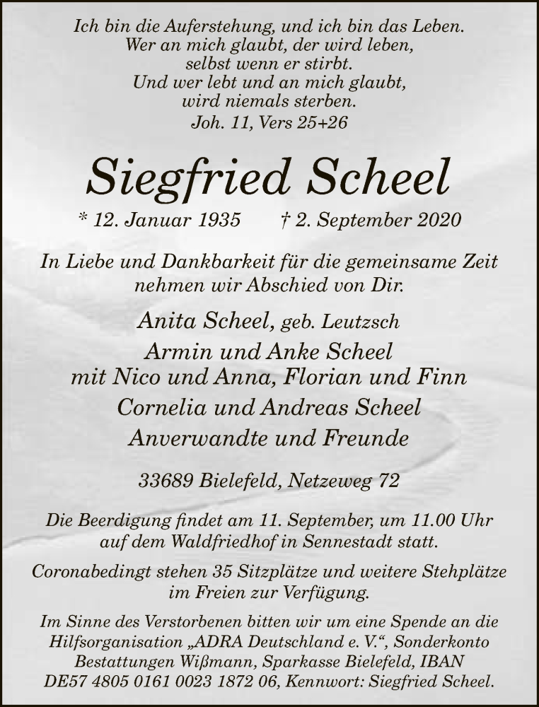 Hier finden Sie alle Traueranzeigen aus der Zeitung, die bisher für Siegfried Scheel erschienen sind. Weitere Traueranzeigen, die in der Zeitung erscheinen, werden hier ebenfalls aufgelistet