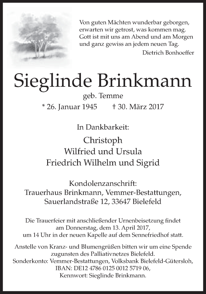 Hier finden Sie alle Traueranzeigen aus der Zeitung, die bisher für Sieglinde Brinkmann erschienen sind. Weitere Traueranzeigen, die in der Zeitung erscheinen, werden hier ebenfalls aufgelistet