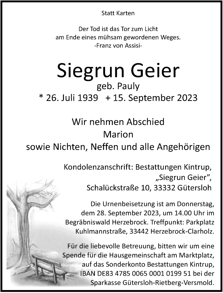Hier finden Sie alle Traueranzeigen aus der Zeitung, die bisher für Siegrun Geier erschienen sind. Weitere Traueranzeigen, die in der Zeitung erscheinen, werden hier ebenfalls aufgelistet