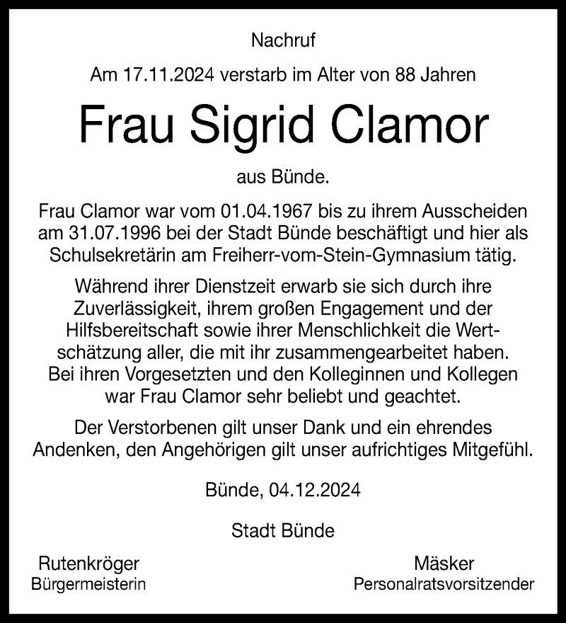 Hier finden Sie alle Traueranzeigen aus der Zeitung, die bisher für Sigrid Clamor erschienen sind. Weitere Traueranzeigen, die in der Zeitung erscheinen, werden hier ebenfalls aufgelistet