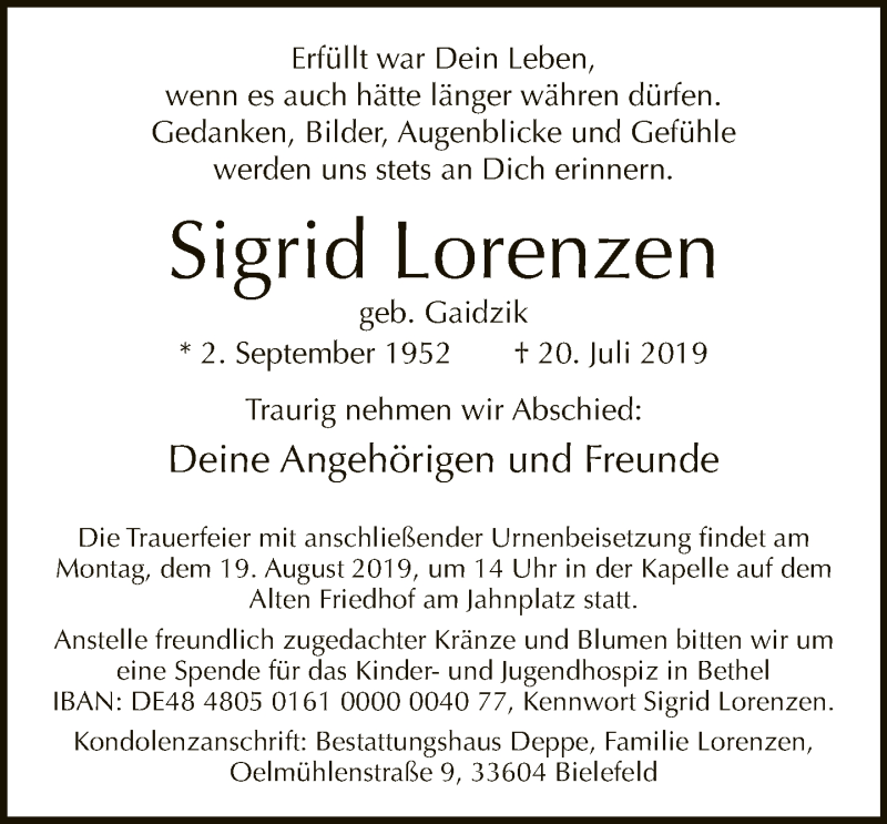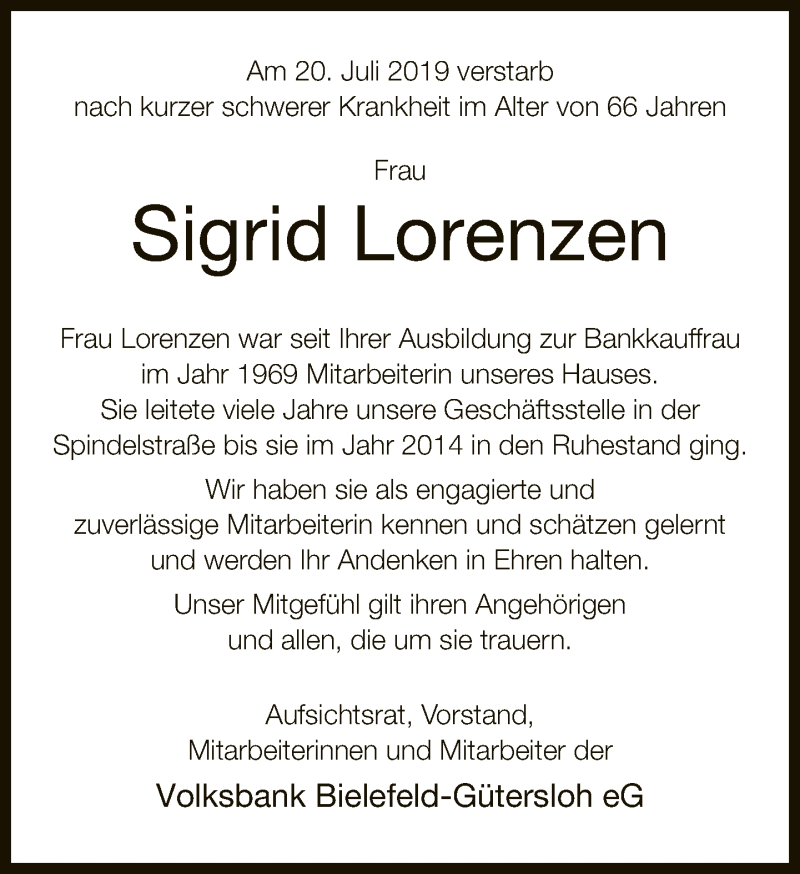 Hier finden Sie alle Traueranzeigen aus der Zeitung, die bisher für Sigrid Lorenzen erschienen sind. Weitere Traueranzeigen, die in der Zeitung erscheinen, werden hier ebenfalls aufgelistet