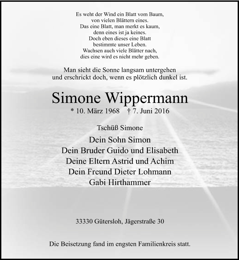 Hier finden Sie alle Traueranzeigen aus der Zeitung, die bisher für Simone Wippermann erschienen sind. Weitere Traueranzeigen, die in der Zeitung erscheinen, werden hier ebenfalls aufgelistet