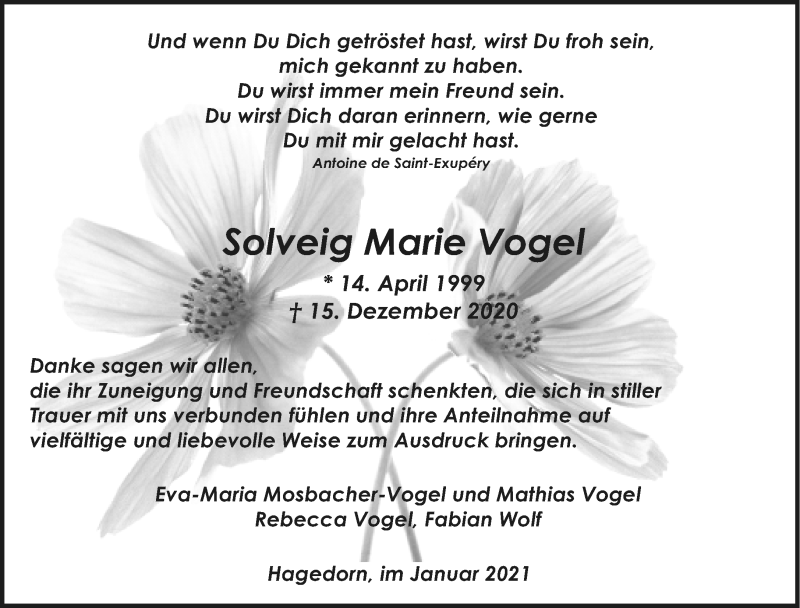 Hier finden Sie alle Traueranzeigen aus der Zeitung, die bisher für Solveig Marie Vogel erschienen sind. Weitere Traueranzeigen, die in der Zeitung erscheinen, werden hier ebenfalls aufgelistet