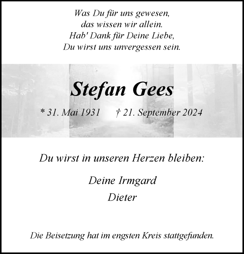 Hier finden Sie alle Traueranzeigen aus der Zeitung, die bisher für Stefan Gees erschienen sind. Weitere Traueranzeigen, die in der Zeitung erscheinen, werden hier ebenfalls aufgelistet