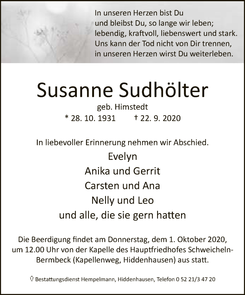 Hier finden Sie alle Traueranzeigen aus der Zeitung, die bisher für Susanne Sudhölter erschienen sind. Weitere Traueranzeigen, die in der Zeitung erscheinen, werden hier ebenfalls aufgelistet