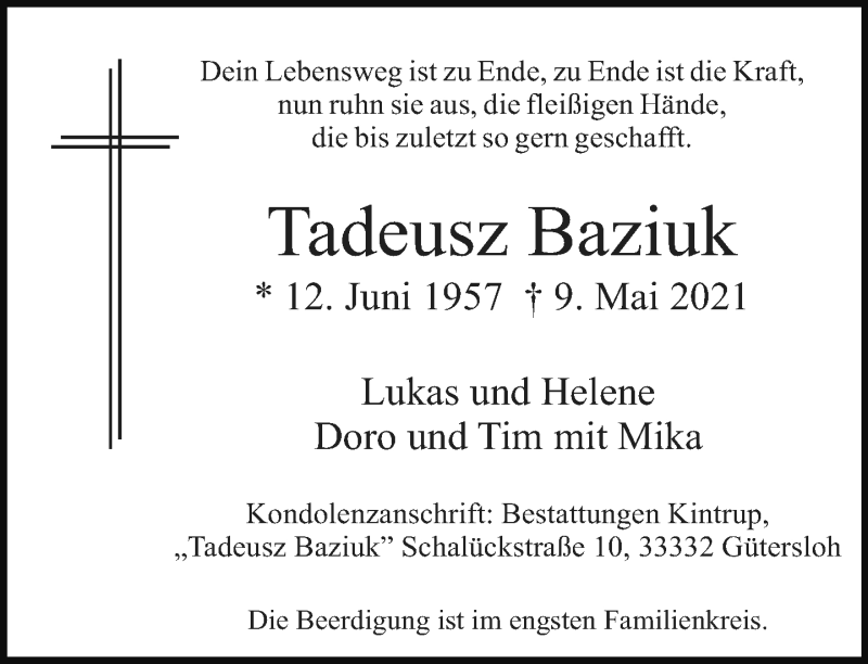 Hier finden Sie alle Traueranzeigen aus der Zeitung, die bisher für Tadeusz Baziuk erschienen sind. Weitere Traueranzeigen, die in der Zeitung erscheinen, werden hier ebenfalls aufgelistet