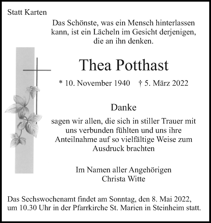 Hier finden Sie alle Traueranzeigen aus der Zeitung, die bisher für Thea Potthast erschienen sind. Weitere Traueranzeigen, die in der Zeitung erscheinen, werden hier ebenfalls aufgelistet