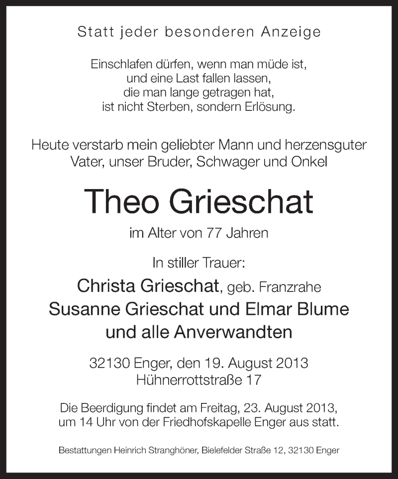 Hier finden Sie alle Traueranzeigen aus der Zeitung, die bisher für Theo Grieschat erschienen sind. Weitere Traueranzeigen, die in der Zeitung erscheinen, werden hier ebenfalls aufgelistet