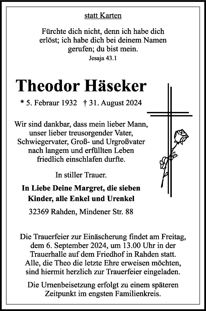 Hier finden Sie alle Traueranzeigen aus der Zeitung, die bisher für Theodor Häseker erschienen sind. Weitere Traueranzeigen, die in der Zeitung erscheinen, werden hier ebenfalls aufgelistet