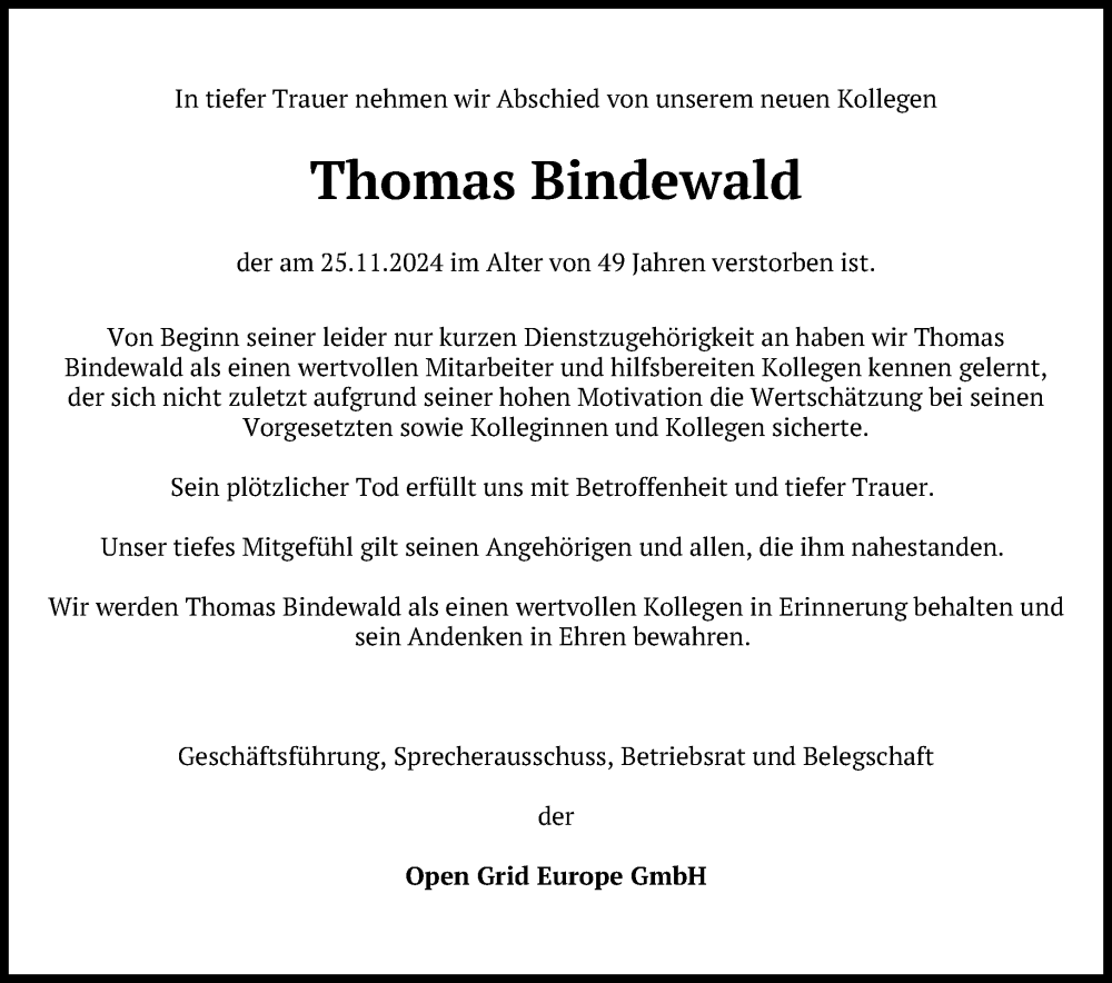 Hier finden Sie alle Traueranzeigen aus der Zeitung, die bisher für Thomas Bindewald erschienen sind. Weitere Traueranzeigen, die in der Zeitung erscheinen, werden hier ebenfalls aufgelistet