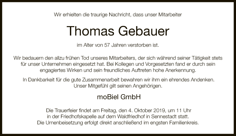 Hier finden Sie alle Traueranzeigen aus der Zeitung, die bisher für Thomas Gebauer erschienen sind. Weitere Traueranzeigen, die in der Zeitung erscheinen, werden hier ebenfalls aufgelistet