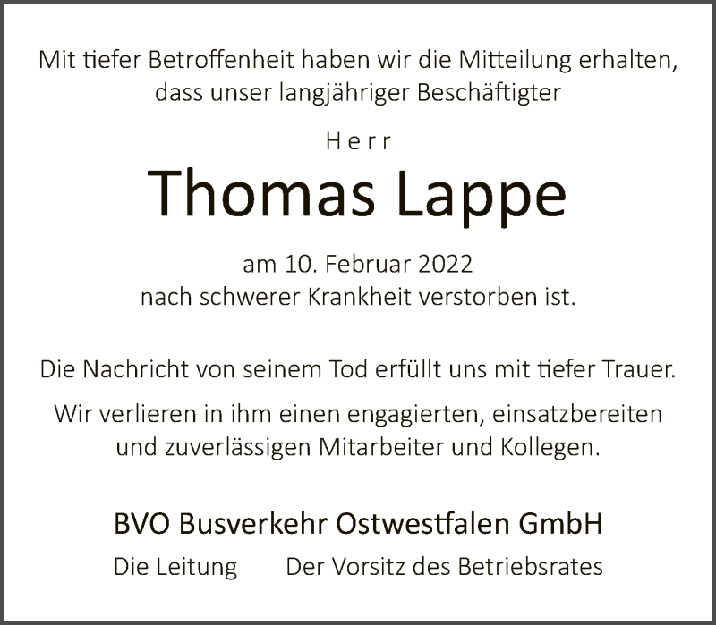 Hier finden Sie alle Traueranzeigen aus der Zeitung, die bisher für Thomas Lappe erschienen sind. Weitere Traueranzeigen, die in der Zeitung erscheinen, werden hier ebenfalls aufgelistet