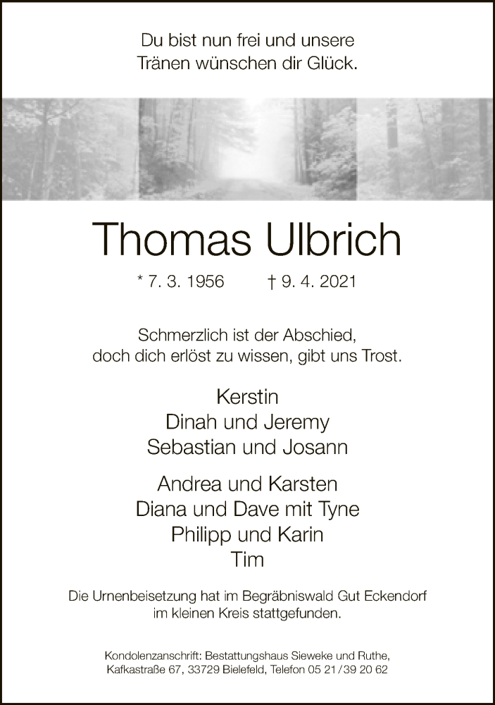 Hier finden Sie alle Traueranzeigen aus der Zeitung, die bisher für Thomas Ulbrich erschienen sind. Weitere Traueranzeigen, die in der Zeitung erscheinen, werden hier ebenfalls aufgelistet