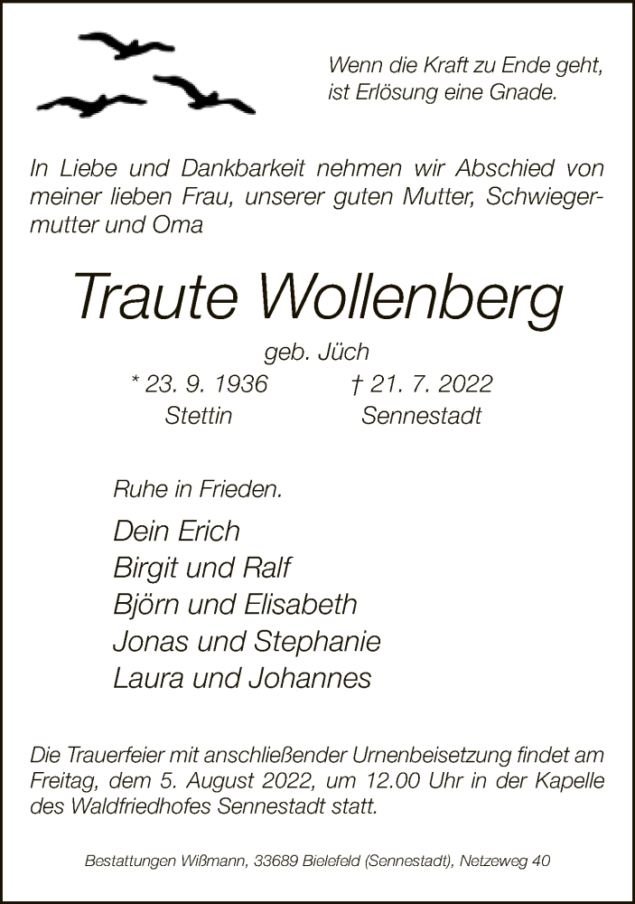 Hier finden Sie alle Traueranzeigen aus der Zeitung, die bisher für Traute Wollenberg erschienen sind. Weitere Traueranzeigen, die in der Zeitung erscheinen, werden hier ebenfalls aufgelistet