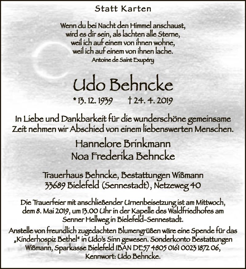 Hier finden Sie alle Traueranzeigen aus der Zeitung, die bisher für Udo Behncke erschienen sind. Weitere Traueranzeigen, die in der Zeitung erscheinen, werden hier ebenfalls aufgelistet