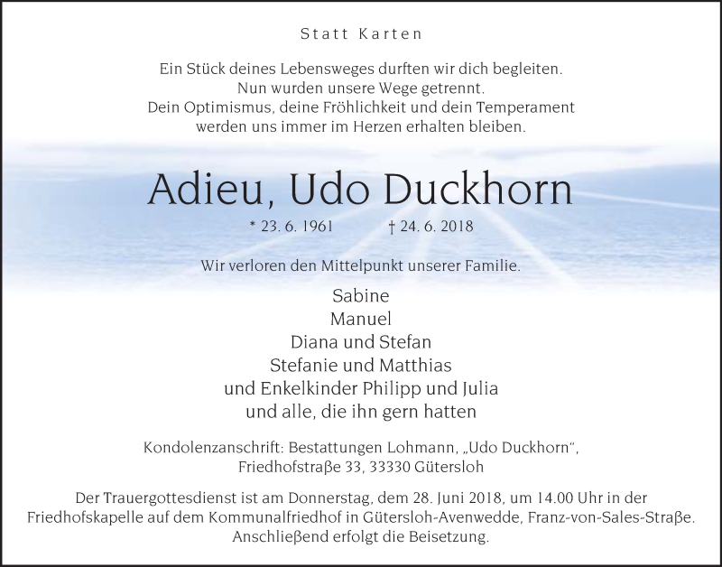Hier finden Sie alle Traueranzeigen aus der Zeitung, die bisher für Udo Duckhorn erschienen sind. Weitere Traueranzeigen, die in der Zeitung erscheinen, werden hier ebenfalls aufgelistet