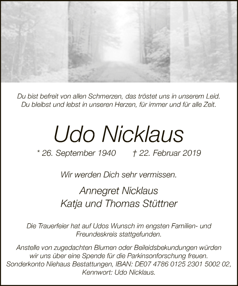 Hier finden Sie alle Traueranzeigen aus der Zeitung, die bisher für Udo Nicklaus erschienen sind. Weitere Traueranzeigen, die in der Zeitung erscheinen, werden hier ebenfalls aufgelistet