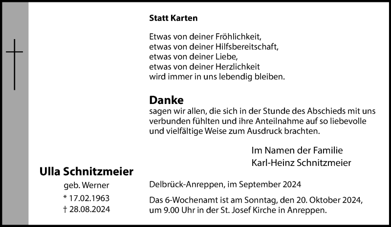 Hier finden Sie alle Traueranzeigen aus der Zeitung, die bisher für Ulla Schnitzmeier erschienen sind. Weitere Traueranzeigen, die in der Zeitung erscheinen, werden hier ebenfalls aufgelistet