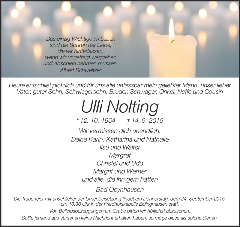 Hier finden Sie alle Traueranzeigen aus der Zeitung, die bisher für Ulli Nolting erschienen sind. Weitere Traueranzeigen, die in der Zeitung erscheinen, werden hier ebenfalls aufgelistet