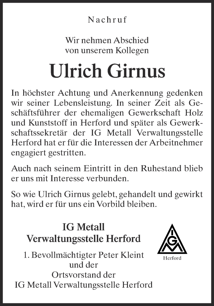 Hier finden Sie alle Traueranzeigen aus der Zeitung, die bisher für Ulrich Girnus erschienen sind. Weitere Traueranzeigen, die in der Zeitung erscheinen, werden hier ebenfalls aufgelistet