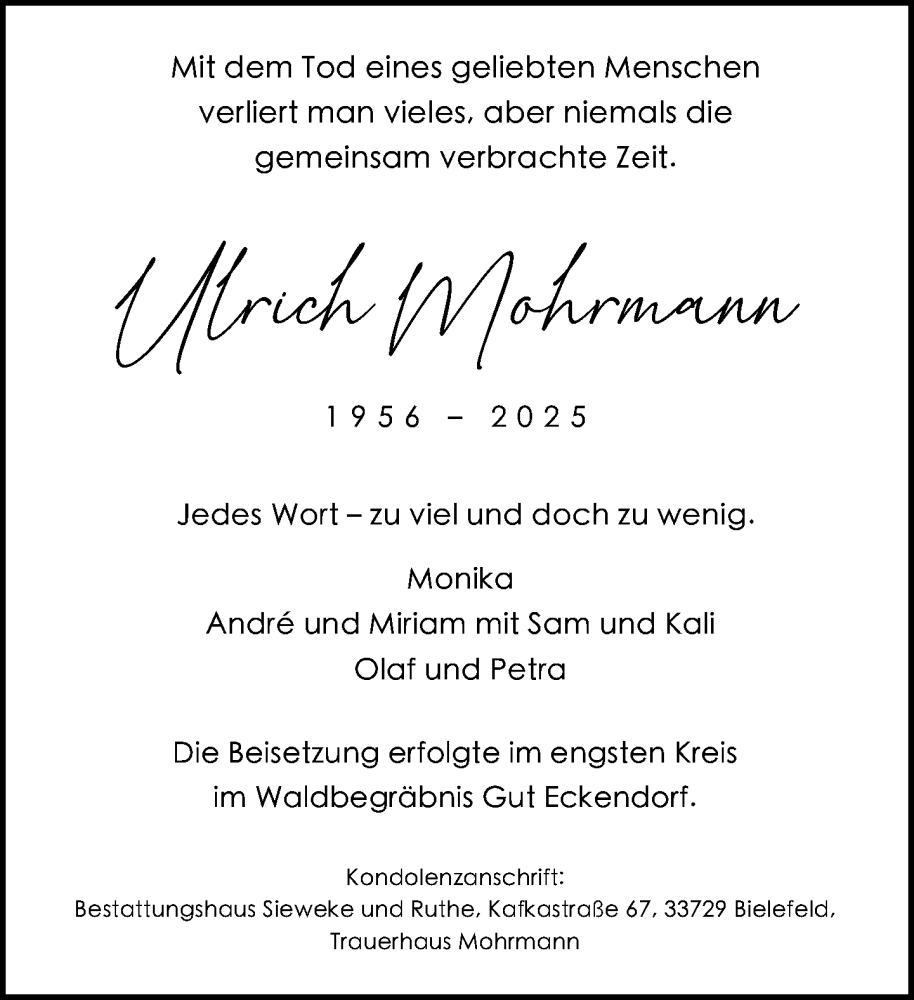 Hier finden Sie alle Traueranzeigen aus der Zeitung, die bisher für Ulrich Mohrmann erschienen sind. Weitere Traueranzeigen, die in der Zeitung erscheinen, werden hier ebenfalls aufgelistet