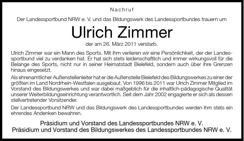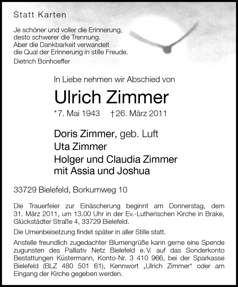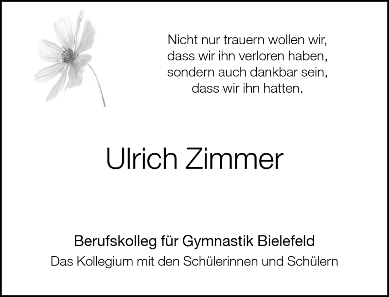 Hier finden Sie alle Traueranzeigen aus der Zeitung, die bisher für Ulrich Zimmer erschienen sind. Weitere Traueranzeigen, die in der Zeitung erscheinen, werden hier ebenfalls aufgelistet