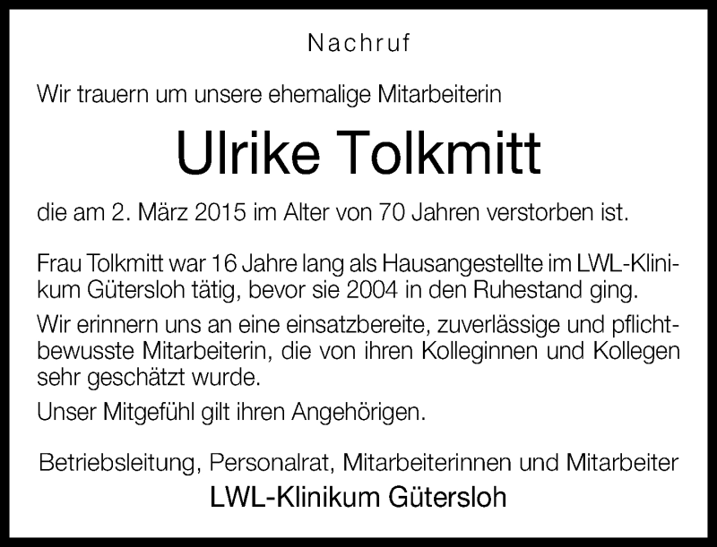 Hier finden Sie alle Traueranzeigen aus der Zeitung, die bisher für Ulrike Tolkmitt erschienen sind. Weitere Traueranzeigen, die in der Zeitung erscheinen, werden hier ebenfalls aufgelistet