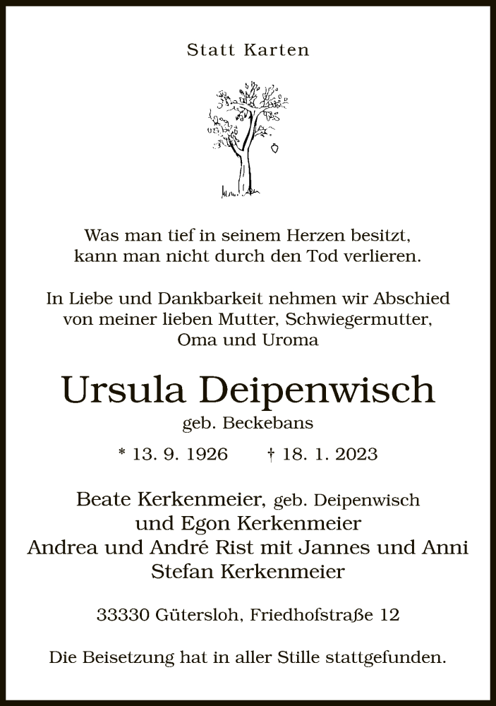Hier finden Sie alle Traueranzeigen aus der Zeitung, die bisher für Ursula Deipenwisch erschienen sind. Weitere Traueranzeigen, die in der Zeitung erscheinen, werden hier ebenfalls aufgelistet