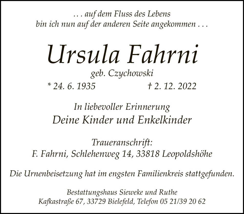 Hier finden Sie alle Traueranzeigen aus der Zeitung, die bisher für Ursula Fahrni erschienen sind. Weitere Traueranzeigen, die in der Zeitung erscheinen, werden hier ebenfalls aufgelistet