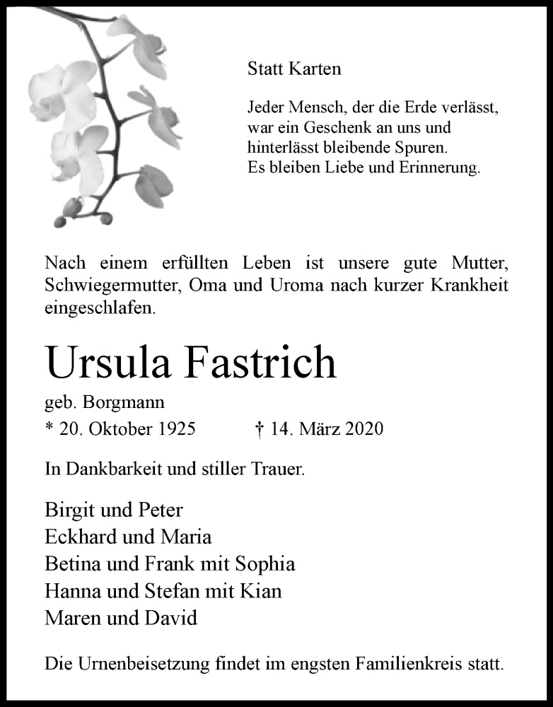Hier finden Sie alle Traueranzeigen aus der Zeitung, die bisher für Ursula Fastrich erschienen sind. Weitere Traueranzeigen, die in der Zeitung erscheinen, werden hier ebenfalls aufgelistet