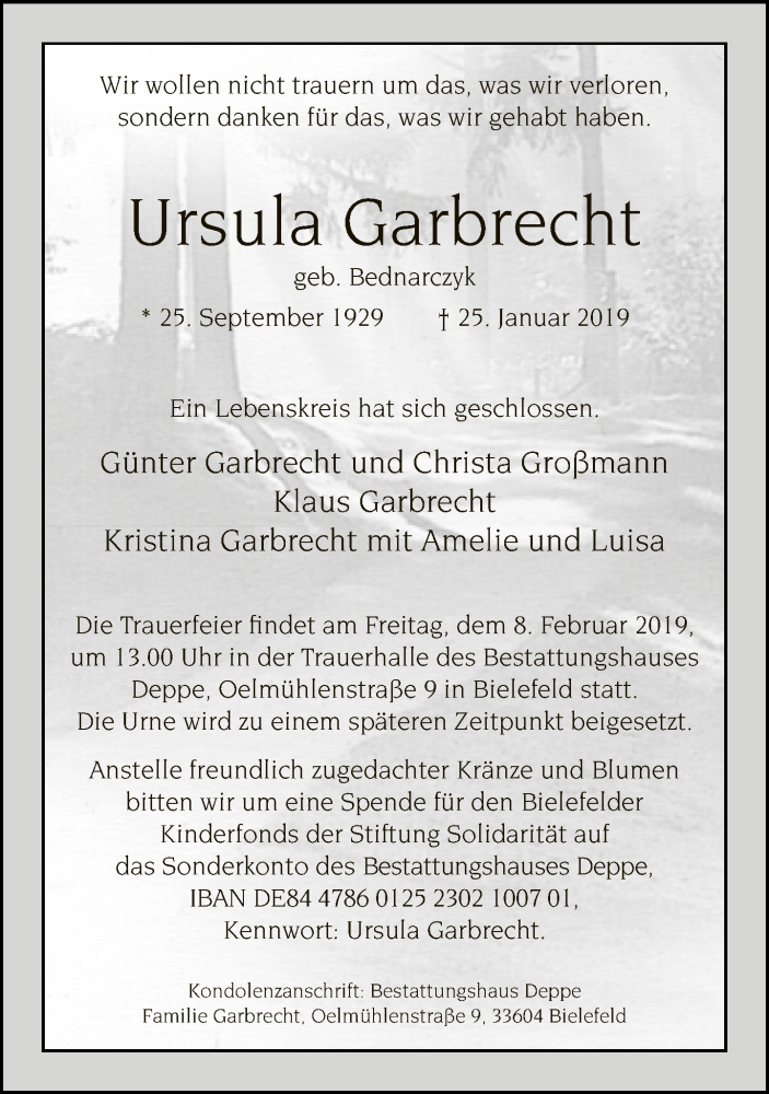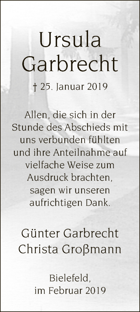 Hier finden Sie alle Traueranzeigen aus der Zeitung, die bisher für Ursula Garbrecht erschienen sind. Weitere Traueranzeigen, die in der Zeitung erscheinen, werden hier ebenfalls aufgelistet
