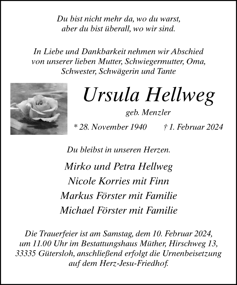 Hier finden Sie alle Traueranzeigen aus der Zeitung, die bisher für Ursula Hellweg erschienen sind. Weitere Traueranzeigen, die in der Zeitung erscheinen, werden hier ebenfalls aufgelistet