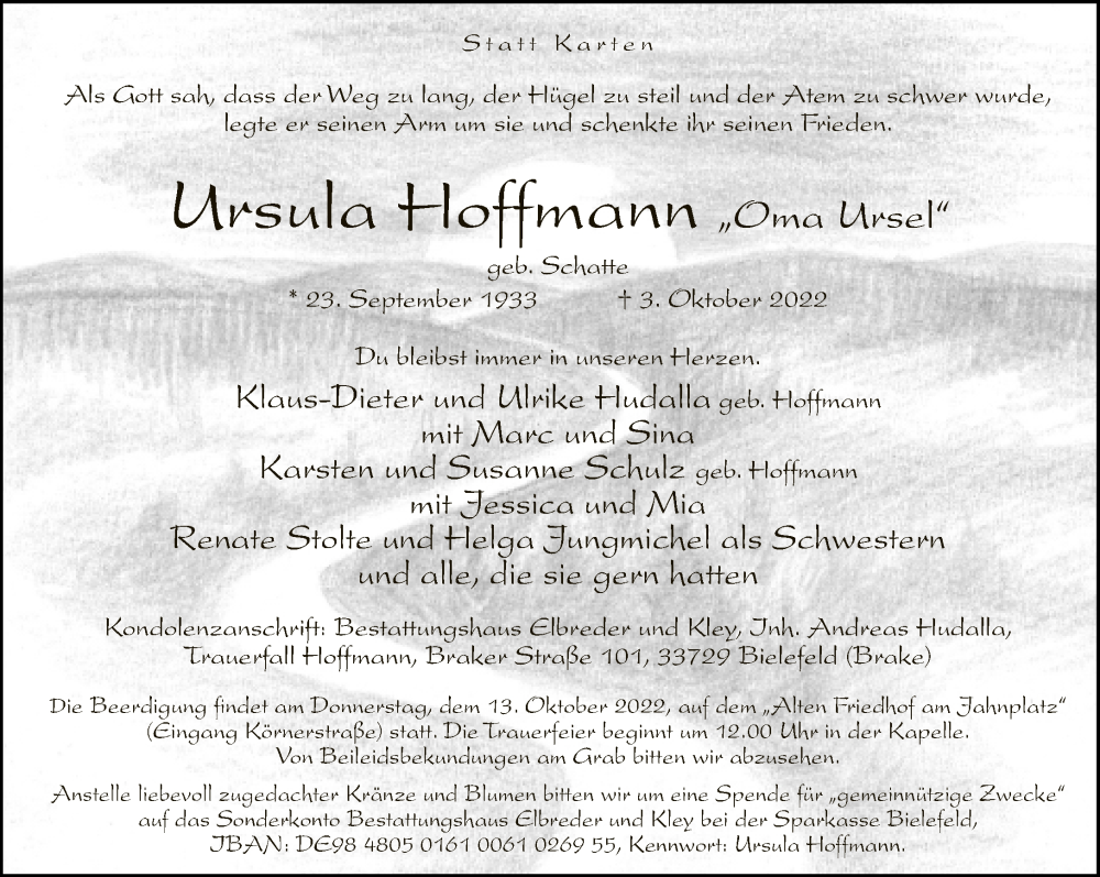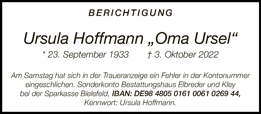 Hier finden Sie alle Traueranzeigen aus der Zeitung, die bisher für Ursula Hoffmann erschienen sind. Weitere Traueranzeigen, die in der Zeitung erscheinen, werden hier ebenfalls aufgelistet