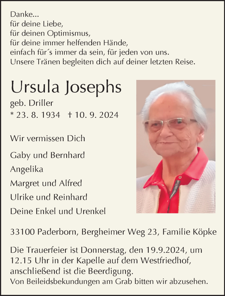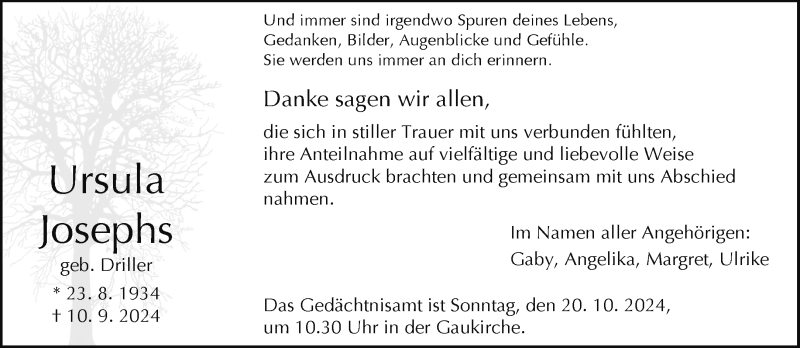 Hier finden Sie alle Traueranzeigen aus der Zeitung, die bisher für Ursula Josephs erschienen sind. Weitere Traueranzeigen, die in der Zeitung erscheinen, werden hier ebenfalls aufgelistet